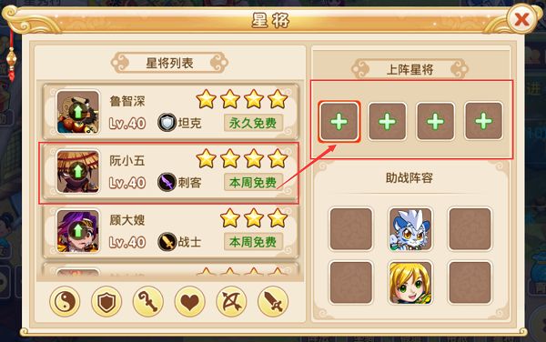 已经上阵的星将自带“—”图标,点击这个图标就会将该星将移除。