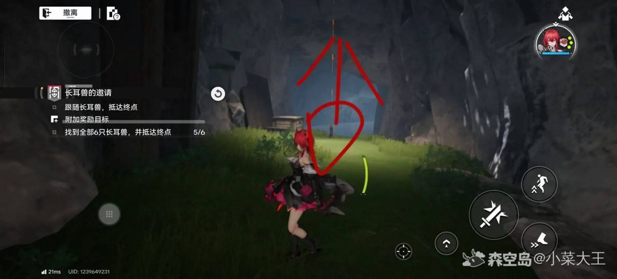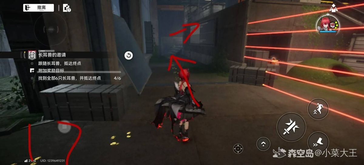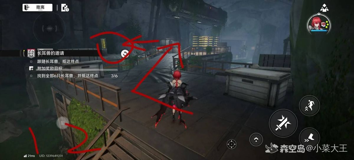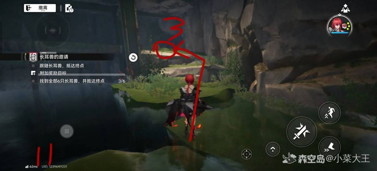 3.跟着路线走,在下坡的右边有一个开关,过去打掉再回来,继续跟着路线走可以找到第三只兔子