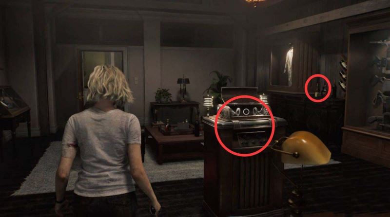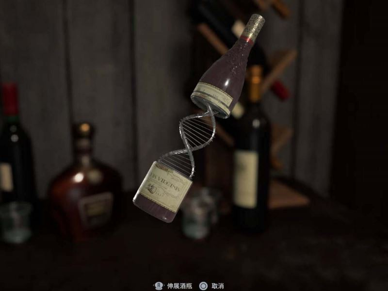 贵宾室里有很多可以互动的物品,其中武器架旁桌上的酒瓶和解谜有关,旋转酒瓶使葡萄图案拼合起来,然后伸展酒瓶得到【双螺旋模型】。把双螺旋模型放到房间中间的台子上,发现整个贵宾室其实是个电梯。