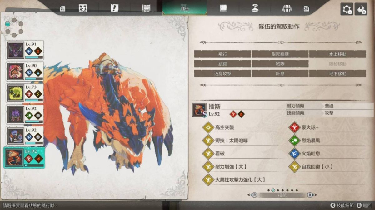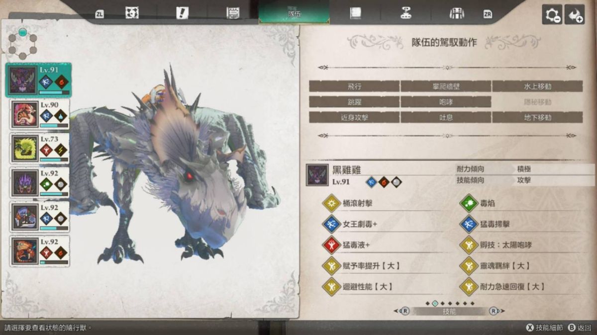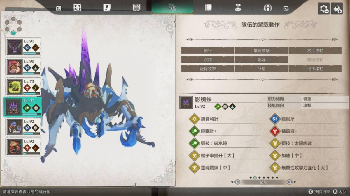 独眼黑狼鸟大招能上剧毒(剧毒>猛毒>毒),攻击也算高,打伤害还算不错用,不过破龙气有点弱,我风神雷神战基本都是靠牠在打猛毒扫击。天眼泡狐龙的狐火泡+可以直接帮怪上命中下降(大),也很好用,当然也可以换成别只装这招,我是顺便拿牠当水上移动。金雷公我是拿来撑雷神龙的攻击跟打全体,其实应该可以换成刚缠兽打龙气更好用,大招也是全体,只是速度可能会有点慢,应该要准备加速的因子。影蜘蛛大招的睡眠有多好用就不用提了。狗就赶路+即死+地下移动。火龙就那样。