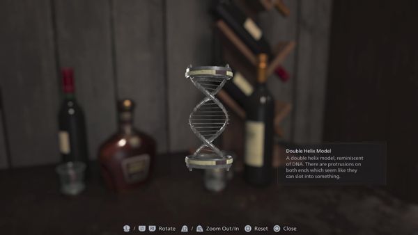 进入访客楼后,氛围会变得诡异起来。走到楼后方的大办公室,里面有很多可互动、可调查的物品,但核心目标是进门左手边的酒瓶。调查这瓶酒时,你可以转动它,最终会从中取出一个双螺旋模型。
