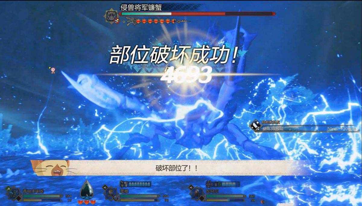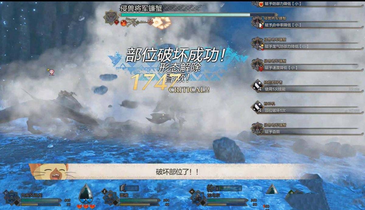 (2回合凹法)镰蟹不防御(凹),任意队友随行兽一起打头壳/梅尔罗先动上降防,白疾风碎地暴击(38会心率)(大概需要1700伤害)直接破壳(玩家可以自己上大剑蓄力,配置略低可以给白疾风丢鬼人药)