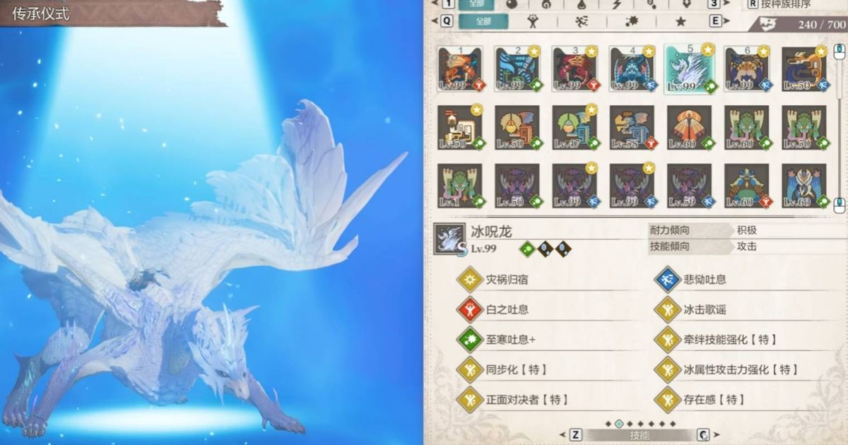 冰击歌谣是冰人鱼龙自带,白之吐息是雪狮子王自带,至寒吐息是冰呪龙自带,悲恸吐息是冰狼龙自带