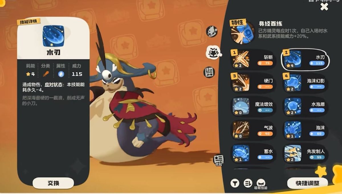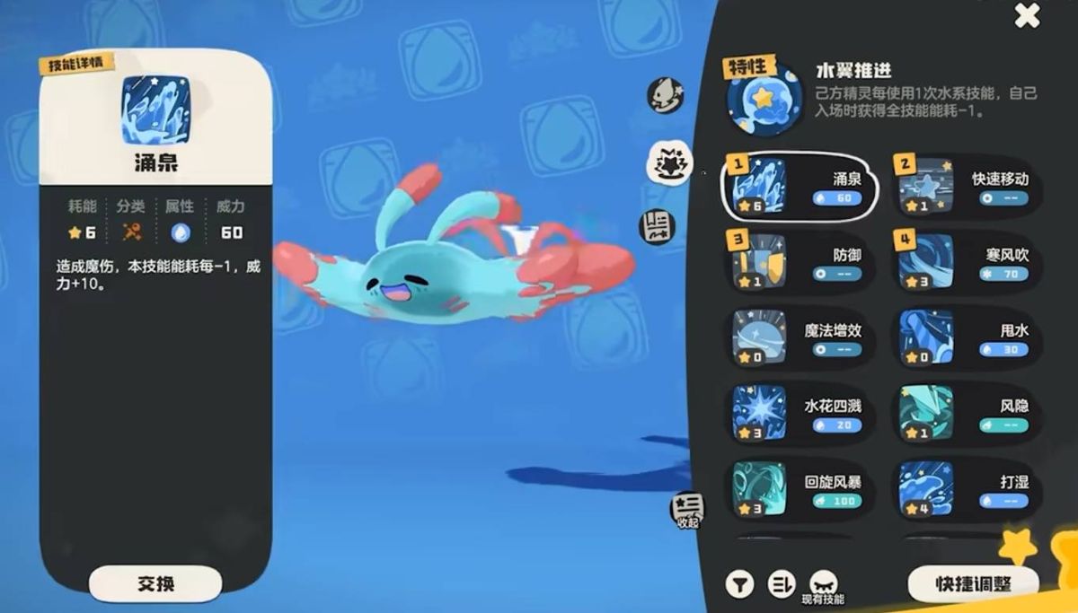 输出选择彩蝶鲨,技能方面推荐涌泉,搭配特性能够有非常高的威力值,其他技能可选择快速移动防御与寒风吹增加弱点攻击范围。