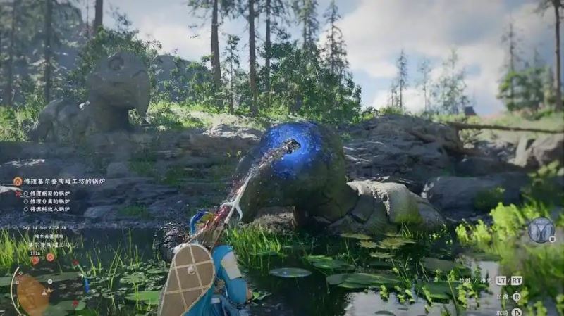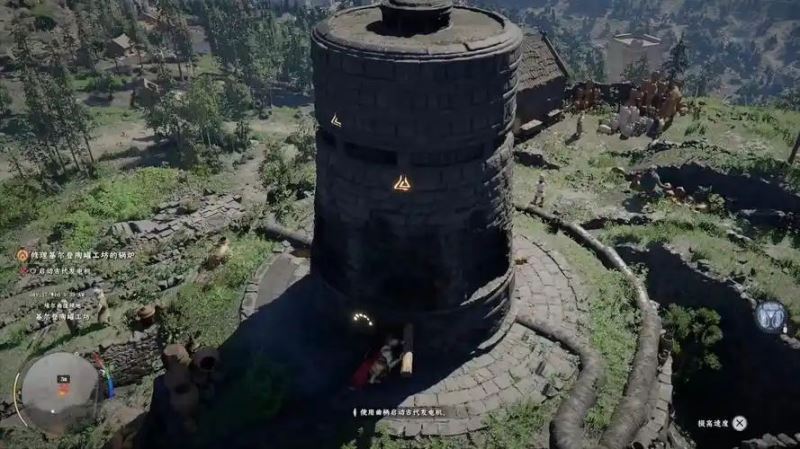 玩家需要先激活古代发电机,通过操作拉杆使发电机上部三个环的 “バイアル” 符号对齐,当符号变为蓝白色光时,发电机启动。发电机启动后,玩家才能进一步修理工坊内的三个熔炉,最终完成任务可获得 “kuku pot”,这是一种可用于收纳大型物品的实用道具。