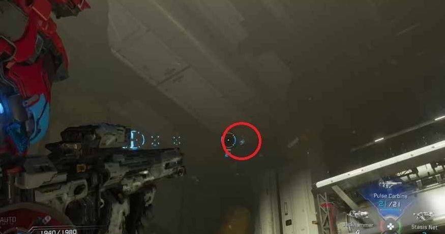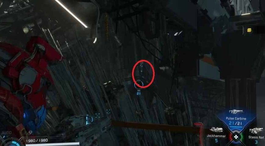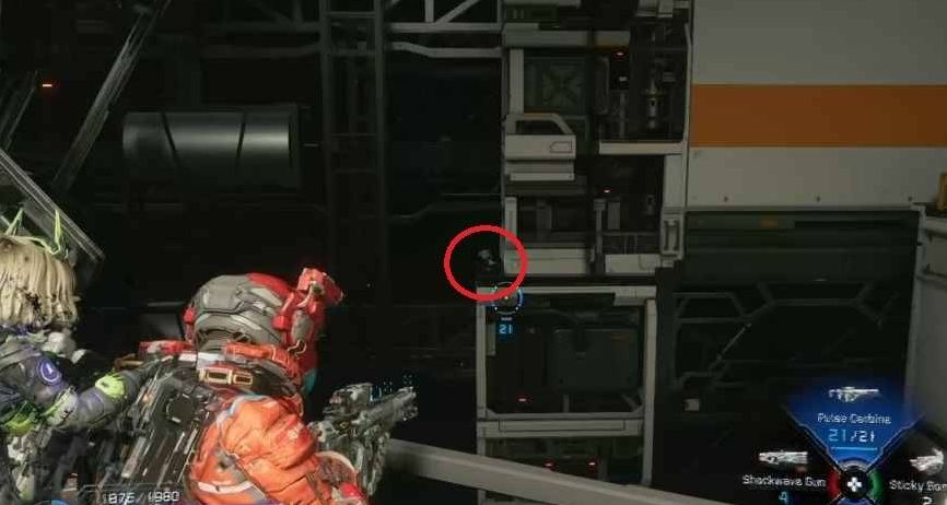 以此处为参照物,转向右上方区域,黄色管道的架设位置上,便能发现迷你阿舱。