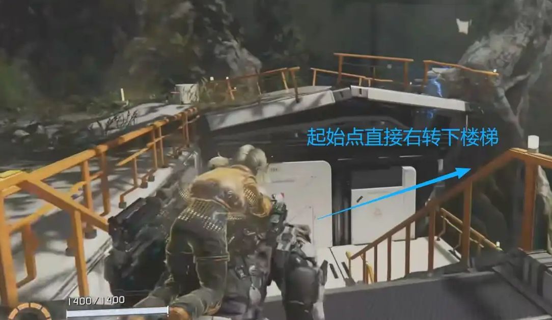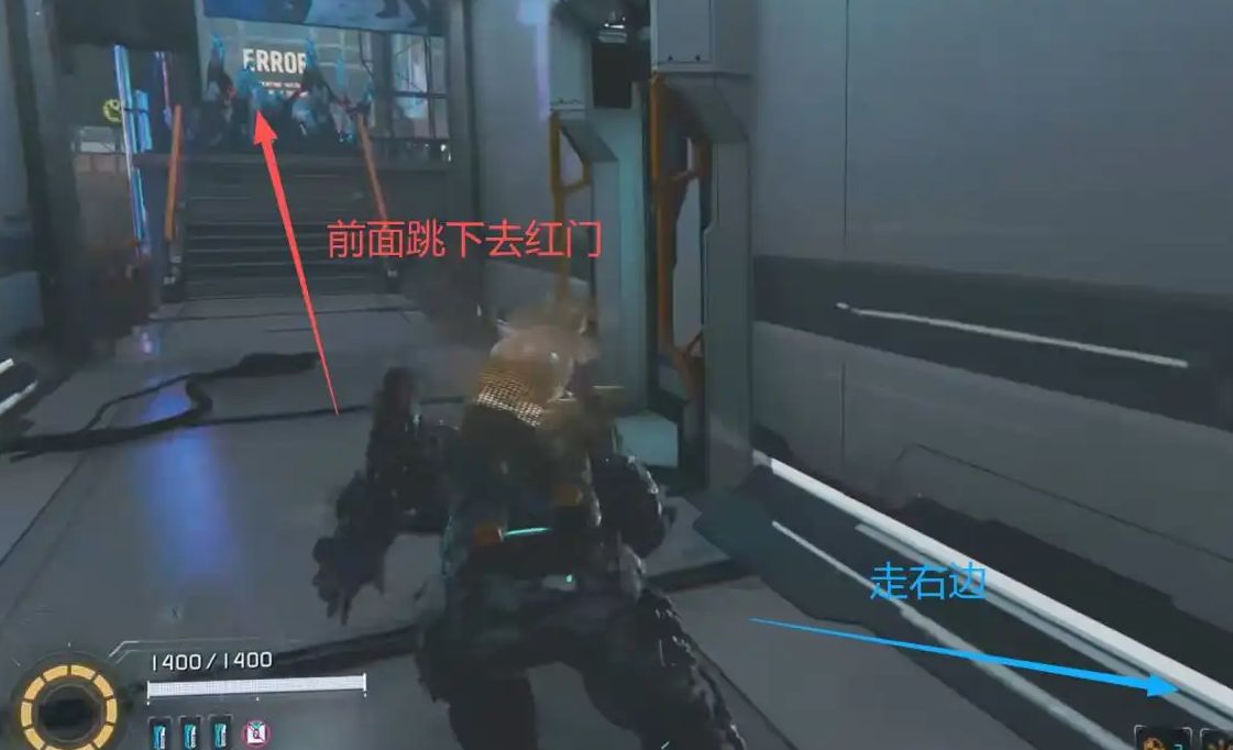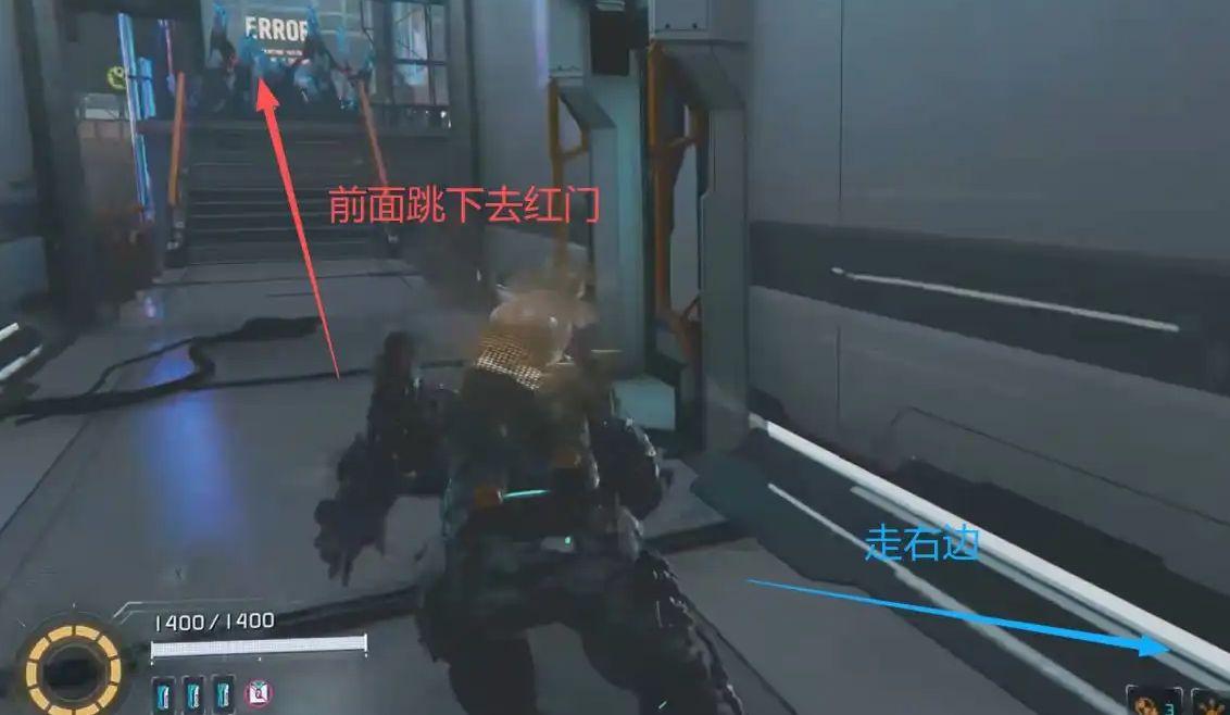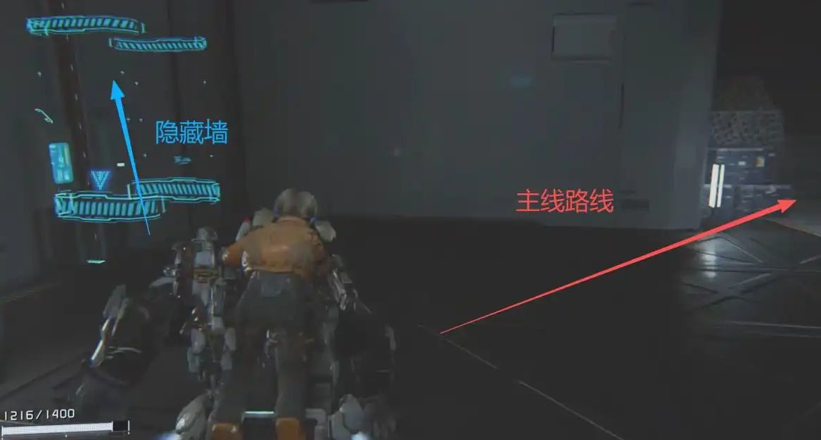 抵达区域后不要跟随主线向下跳跃,沿走廊直行至尽头,借助升降台下沉进入庭院。