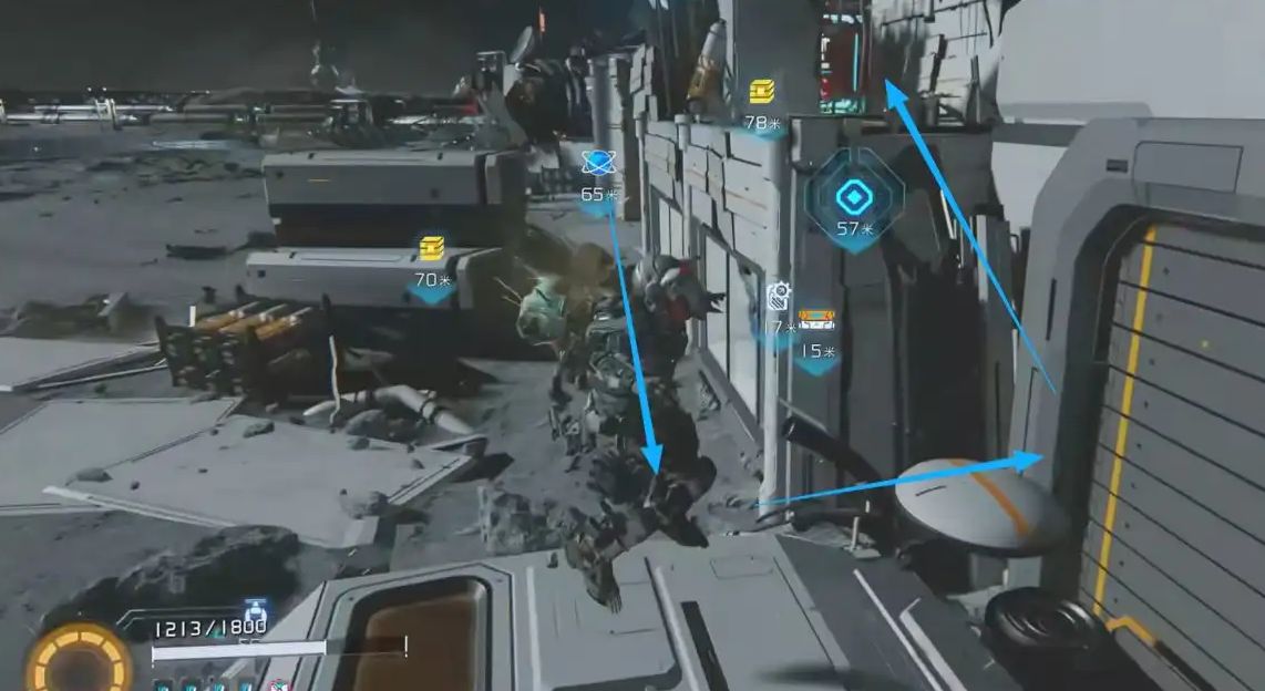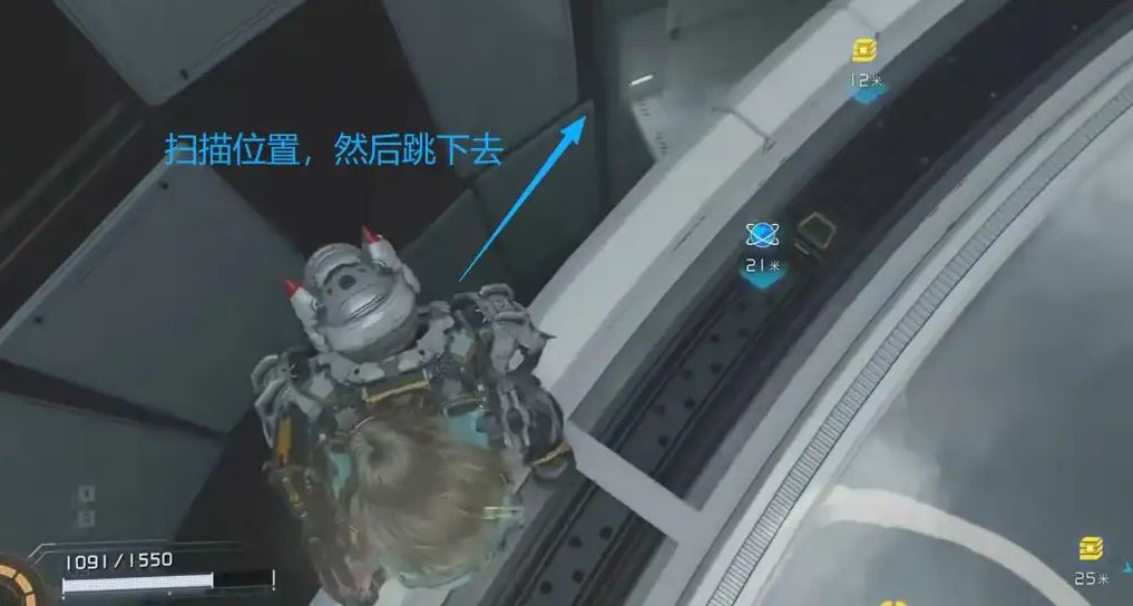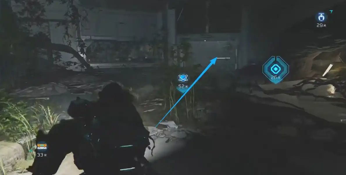 从建筑右侧大门外出,开启扫描技能,能清晰探测到右前方的道具位置。