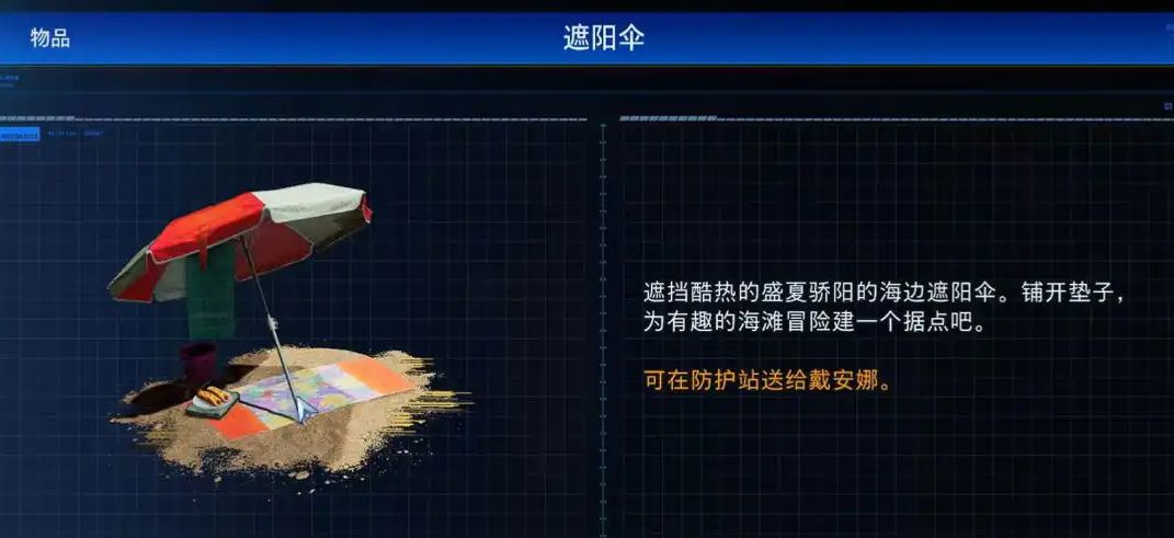 离开站点后,直接前往身后片区,向下跳跃,紧贴墙体缓慢漂浮进入隐蔽角落,就能找到遮阳伞。