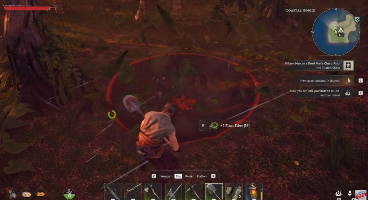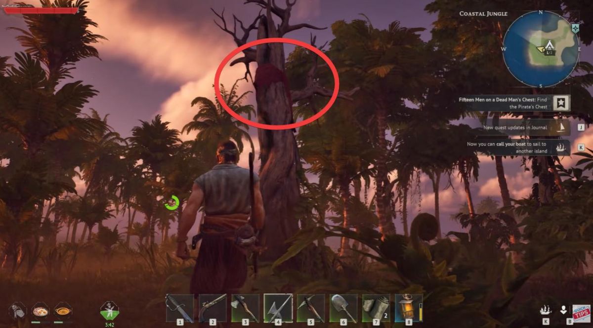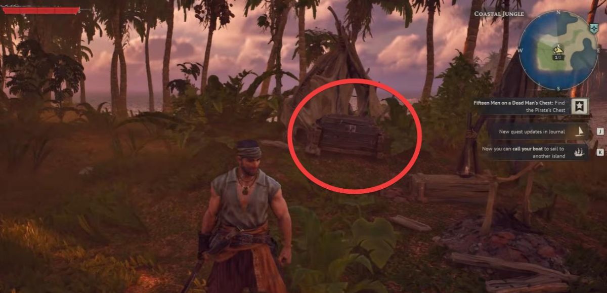起始岛(Coastal Jungle)西南角,地图上标着小帐篷图标。
