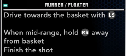 跳步上篮:左摇杆向篮筐运球,在中距离按住LT.并且右摇杆向篮筐左边或者右边推住.