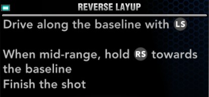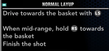 抛投:左摇杆向篮筐运球,在中距离右摇杆拉向远离篮筐方向;平民上篮:左摇杆向篮筐运球,在中距离右摇杆向篮筐方向推住;上反篮:左摇杆延底线运球,在中距离右摇杆向底线方向推住;欧洲步上篮:左摇杆向篮筐运球,在中距离右摇杆向篮筐左边或者右边推住