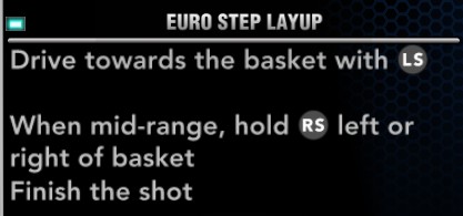 欧洲步上篮:左摇杆向篮筐运球,在中距离右摇杆向篮筐左边或者右边推住.