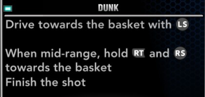 扣篮:左摇杆向篮筐运球,在中距离按住LT,并且右摇杆朝篮筐方向推住.