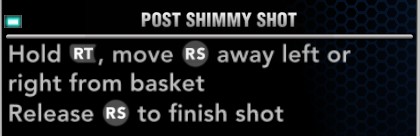 晃肩投篮:按住RT,右摇杆推住远离篮筐方向的左边或者右边,松开完成投篮.