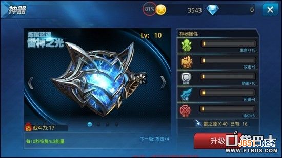 神器是天天炫斗里面一个比较有意思的装备,通过升级它可以给穿戴着增加强大的属性加成效果,关于游戏中应该有至少五种神器,每一种甚至只有通过了一个大地图的所有关卡后才可以得到。下面是天天炫斗雷神之光神器的图鉴,LV10级时的属性,有兴趣可以看下,加成效果还算可以。