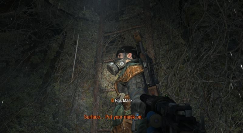 2、两人离开洞穴,需要按G带上防毒面具,地表都被毒气占据,且还有着变异生物。