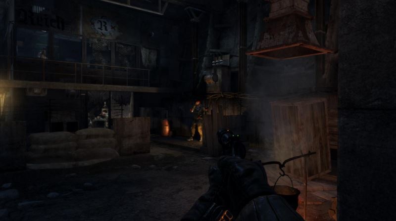 5、去小门有个窄走廊穿过去进入了隔壁,面前有个楼梯解决掉两名士兵,打开拐角处的那扇门,进入剧情点。