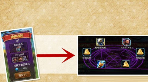 玩家VIP等级达到11级以上,即能召唤神秘魂匣宝箱,魂匣为400钻石购买一次,里面有6个物品栏,可随机获得每日热点英雄的大量灵魂石(3~10个)和各种稀有道具以及每月热点英雄整卡!神秘魂匣中的热点英雄每周更换一次。