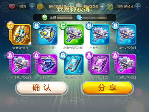 我们可以进入炫飞模式内的“寻宝”抽取我们所需要的装备,其中,玩家每天首次购买装备是免费的。购买装备时还可以获得升级和强化所需要的经验值和强化图纸。