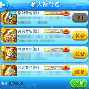 火箭背包应该是游戏中最主要的道具,它控制着玩家的升降和躲避,它的主要属性是增加冲刺时间和增加打豆豆的得分。打豆豆得分指的是消灭地上的小人所获得的分数。火箭背包主要分为:镭射背包、突突背包、导弹背包、烈火背包,每种背包都具有不一样的功能。