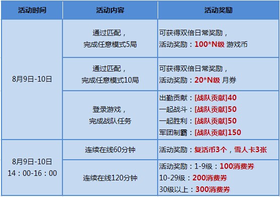 狂欢礼多样,日常工资双倍享。还在为游戏币、月券、军团贡献而发愁吗?这个周末,准时来战,游戏币、月券、贡献值翻倍拿!准保各位特工荷包满满,战斗更给力!