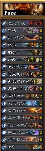 打法思路:前期战士武器清场,随从打脸;中期对面没有嘲讽的情况下,全部打脸。