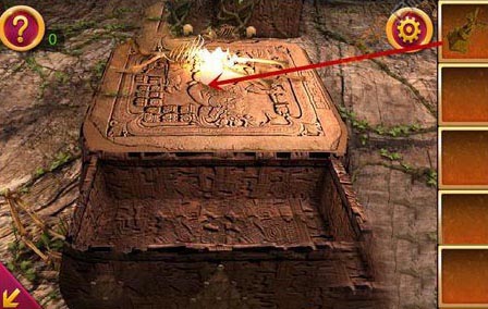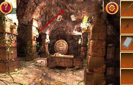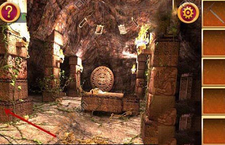 2.得到木棍后,点击图中箭头所指位置,可以看到三个人面石像,点击顺序为左右中,这时得到铁锹的头。