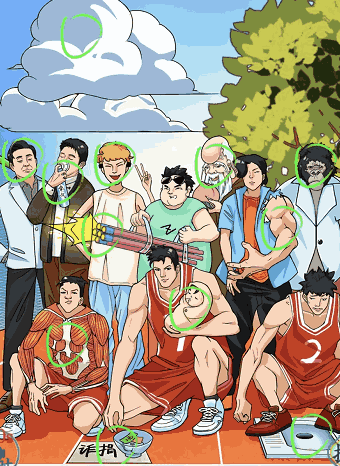 滑动天上云朵可以找到【玉帝打卡】,滑动黄发男子的面具可以找到【欢乐细狗】,中间站着一位【寿星】,蓝色衣服的人是【麒麟臂】,左下角的人穿着【装饰肌肉】,左上角的人是【强哥】,旁边的人在【紧急吸氧】,下面的人在【抱着孩子】,右上角是一个【猩猩】;