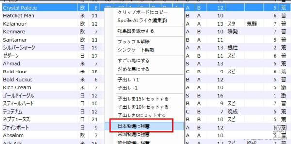 然后根据“特殊配合”排序,找到真稻妻的马,对这这些马点鼠标右键出现修改菜单,选择“日本OO强夺XX”,那这匹马就到我们牧场了。----这个是为了尽快写这篇帖子进行的修改,玩家不喜可以慢慢培养自己的稻妻种群,会更有意思的。
