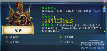 报名方式:建立分堂在定祝(雪竹)、定祈(巴蜀)消耗20金和500点战力报名分堂战。