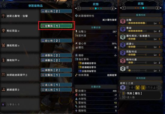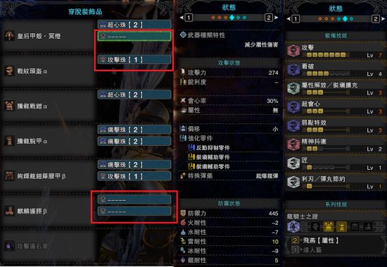 图中所有红色方框圈起来的孔位均为自由孔,配置什么珠子随意,建议特射珠,增加起爆龙弹的伤害。