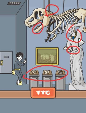 30.点击图中圈出来的地方,在恐龙化石里面得到钥匙、雕像的项链、恐龙上的挂钩(只能拿一个)、叉腰的手,点击天花板上的门,用上挂钩,用钥匙打开身后的门,得到警服,把警服给小回穿上,三个化石位置摆对,得到南瓜。走过去,把三明治里的奶酪拿了,用雕像手识别指纹,保护罩消失。上去把奶酪给老鼠,把挂钩收回再走过去,用挂钩把皇冠拿出来,这时候用南瓜代替皇冠,用挂钩放下去。点击窗子,小回从窗子逃出。