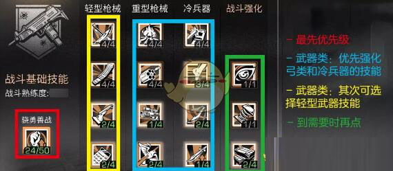 3、其次可优先选择轻型武器技能的升级轻型武器的数量多,而且战斗的伤害和战斗经验的获取都是较为不错的。