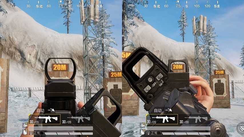 拿M416来举例,在同时配备上红点(全息)和侧面瞄准镜后,开镜后的侧瞄准镜乍一看上去和红点全息外形非常像,更像是它们的缩小版本。从视野来看,侧瞄准镜和红点与全息能看到的可视距离也是一样的。再者,由于侧面瞄准镜是一个偏辅助类型的瞄准镜道具,本身体积也比较小,所以在开镜之后的镜头画面大小上,侧瞄准镜比红点全息能看到的区域更少。在训练营中小编拿20米距离的靶位来进行对比,在同样的位置下,侧面瞄镜开镜后看到的画面要比红点全息小一倍,并且还会因为同时使用两种倍镜的原因遮挡一定的的视野,所以测瞄准镜搭配红点或全息可以说是完全没有必要,得不偿失。