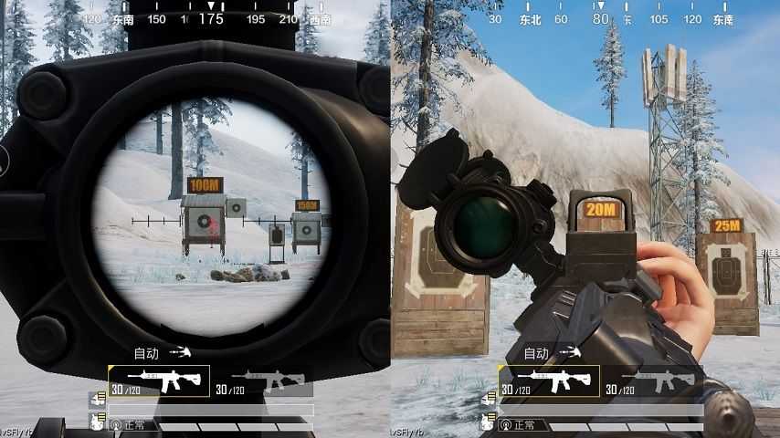 我们再看到中远距离的倍镜,在装备了3倍镜和4倍镜的M416后,同样的距离开镜效果差别不是特别大,所以小编把它们放在一起和侧瞄准镜做搭配对比。从对比图中可以发现,侧瞄准镜不管是在20米或是100米上,在视野上对这两种倍镜的帮助都不大,近的不如它们看得全,稍远点的又不如它们看得清。但是这种中远倍镜虽然视野方面的能力相对比较全面,在攻击移动对手和移动车辆上面的能力却远远不如侧瞄准镜这种近距离倍镜来的顺畅,二者如果搭配起来可以算得上锦上添花了。