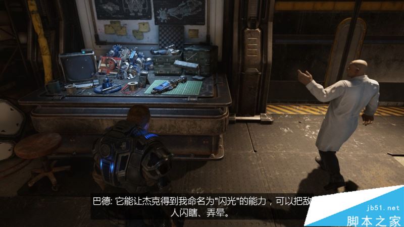 交给我们之后,让我们学会升级改造杰克,首先拾取放在桌上的闪光能力,按Tab进入杰克升级界面。杰克可以装备一个突袭能力和一个支援能力,还拥有四个被动能力,这些能力都可以进行升级。接下来就是去练习如何使用闪光弹,根据教程走就可以,完成之后不要忘了把武器放回原位。