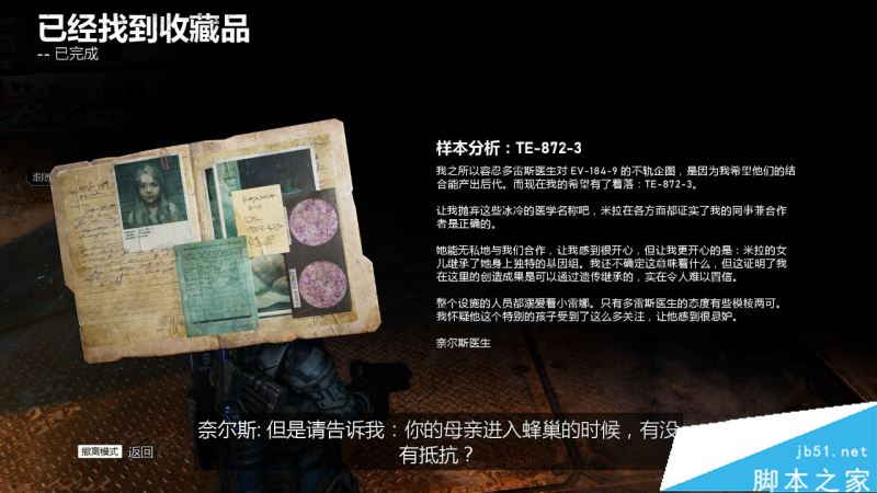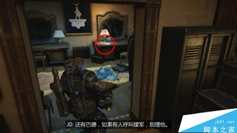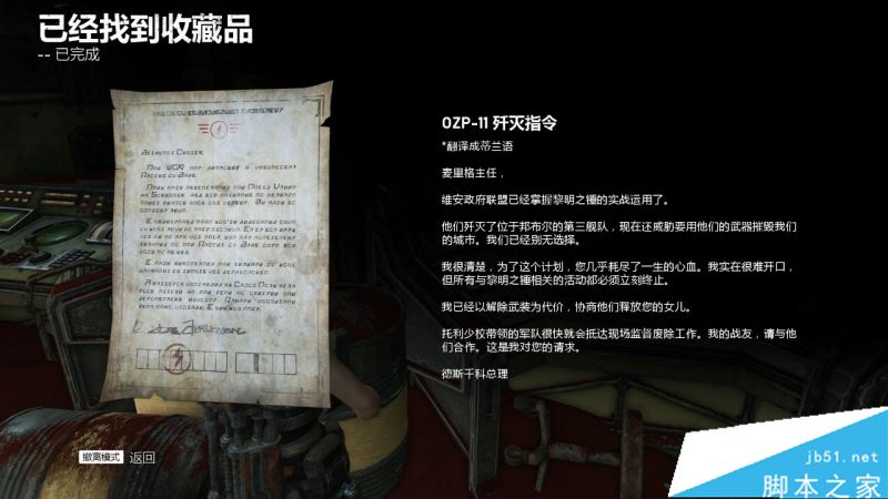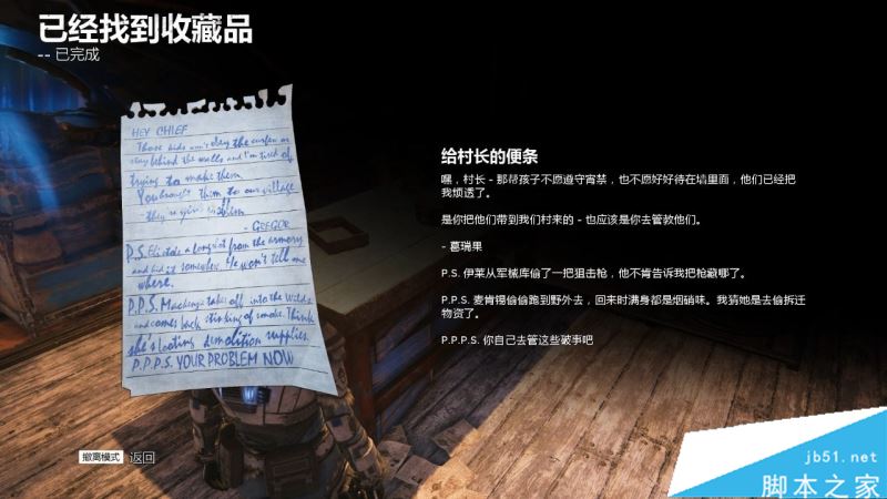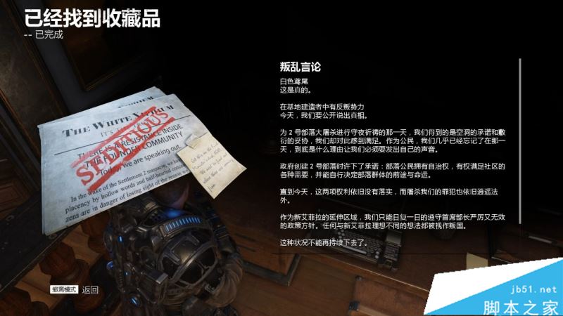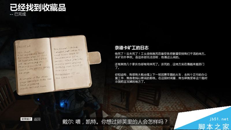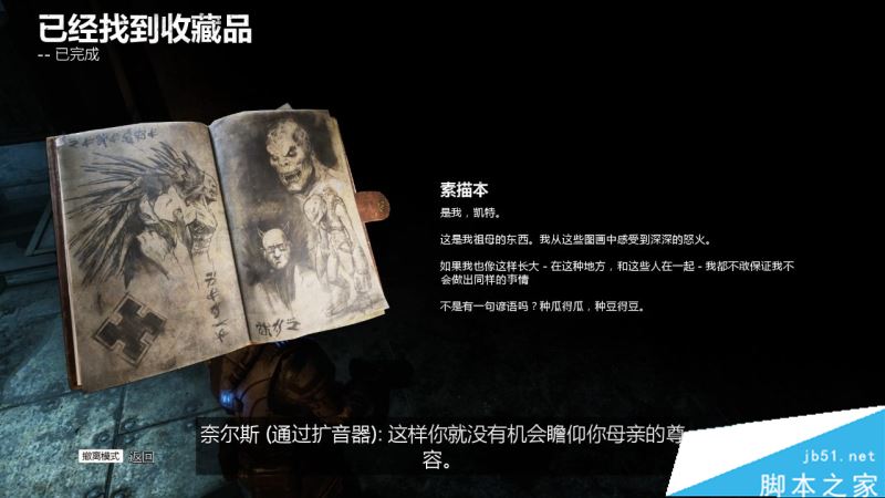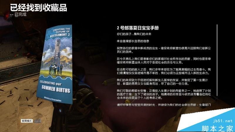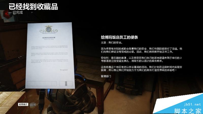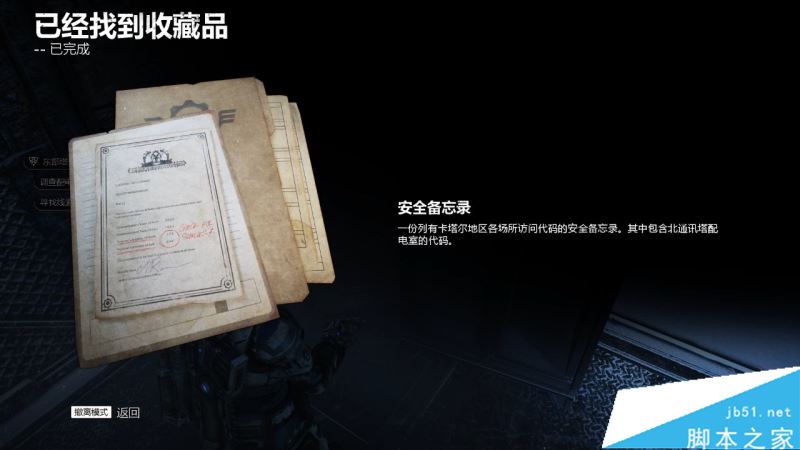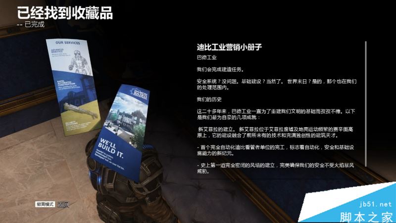 拾取完后,向大门口走去,不要出门,先在门口左侧的椅子上获得【收藏品:迪比工业营销小册子】。全部拾取完后,从大门离开,进入剧情。