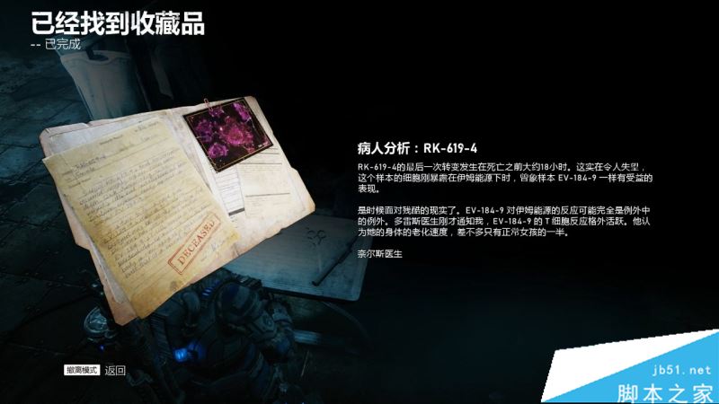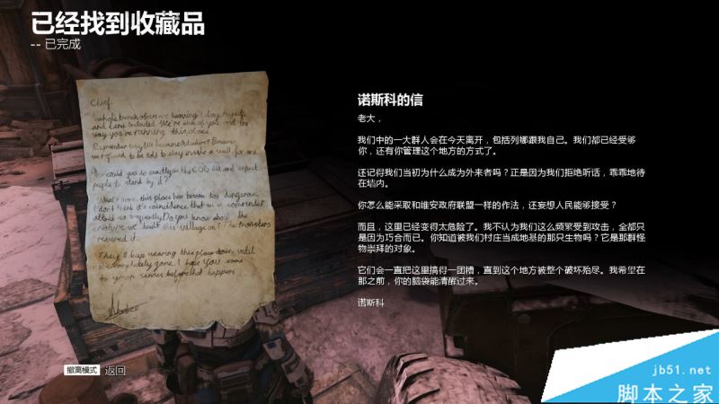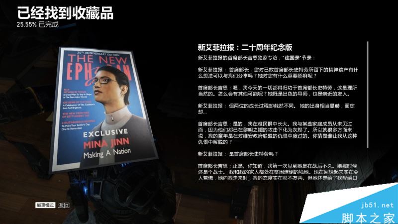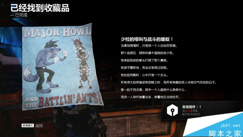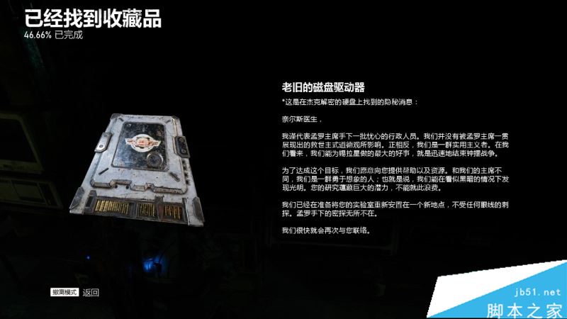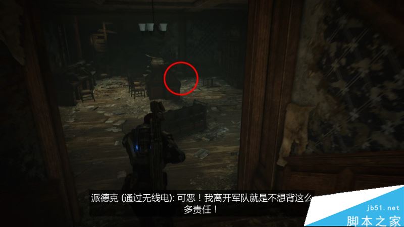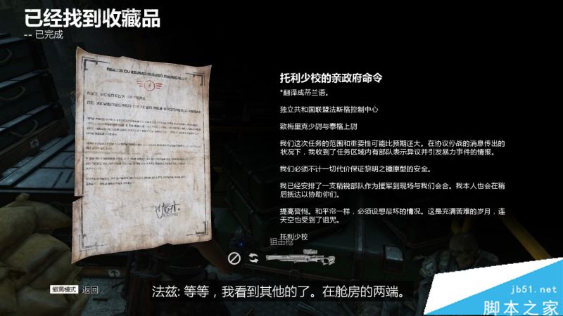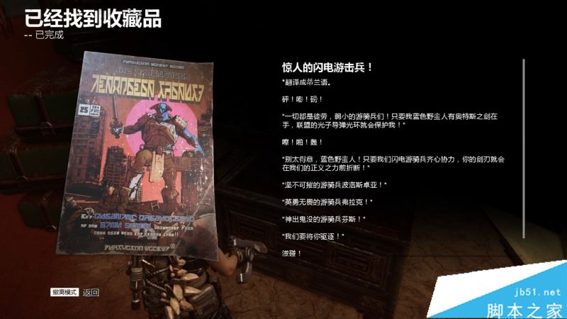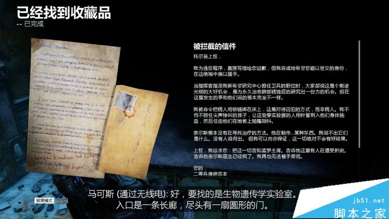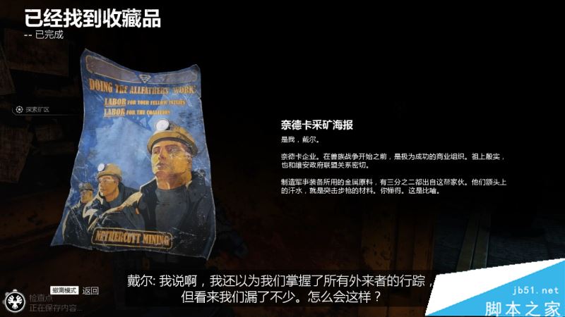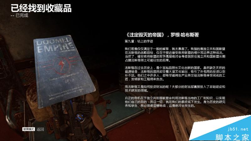 拾取完后,向大门口走去,不要出门,先在门口左侧的椅子上获得【收藏品:迪比工业营销小册子】。全部拾取完后,从大门离开,进入剧情。
