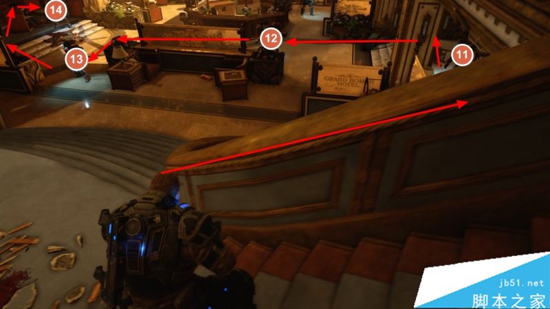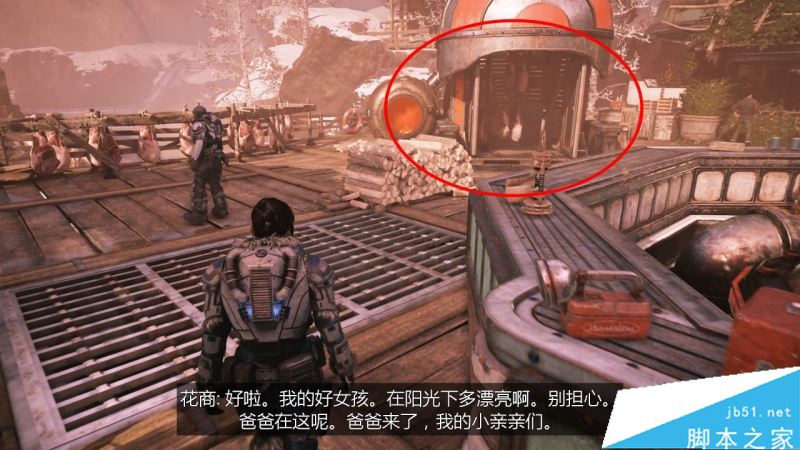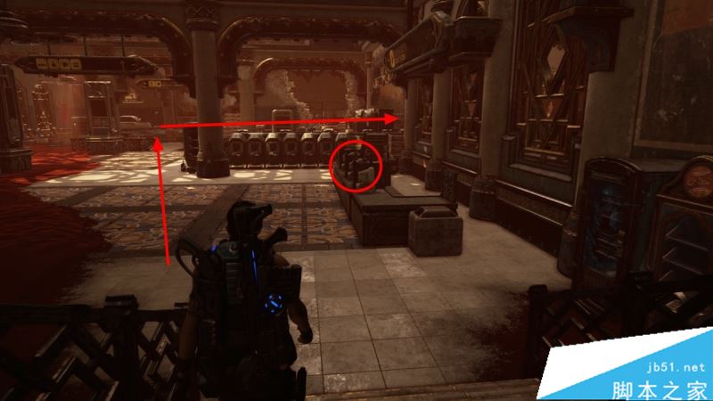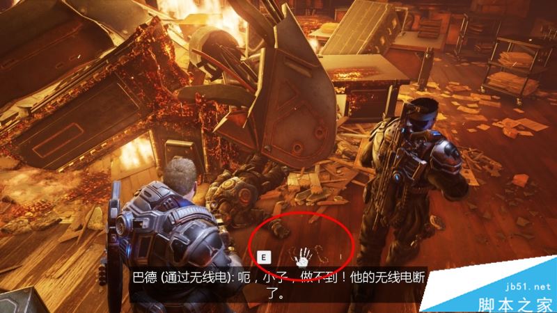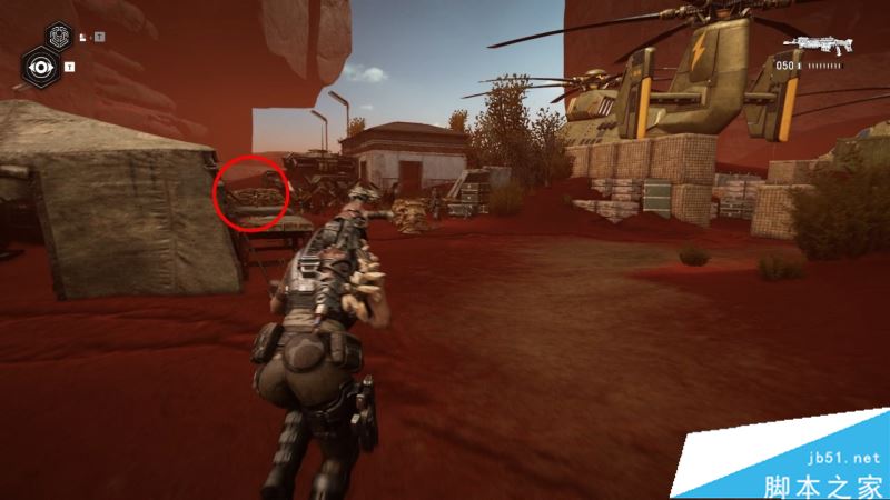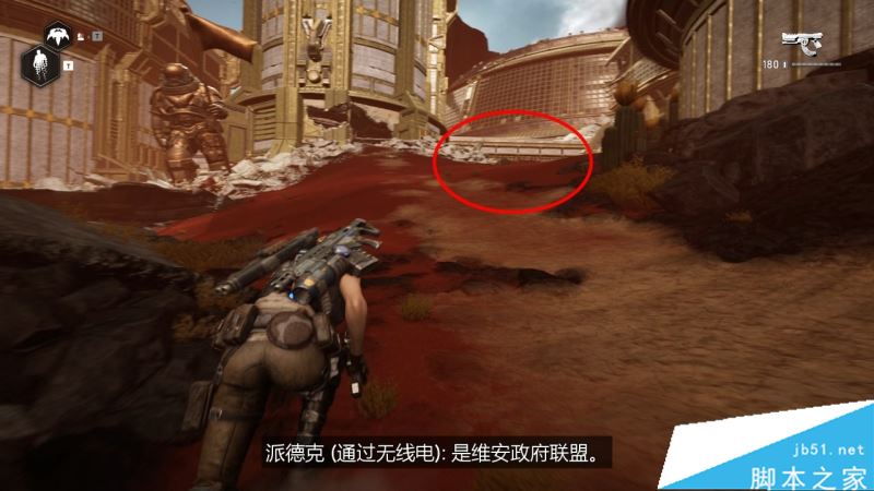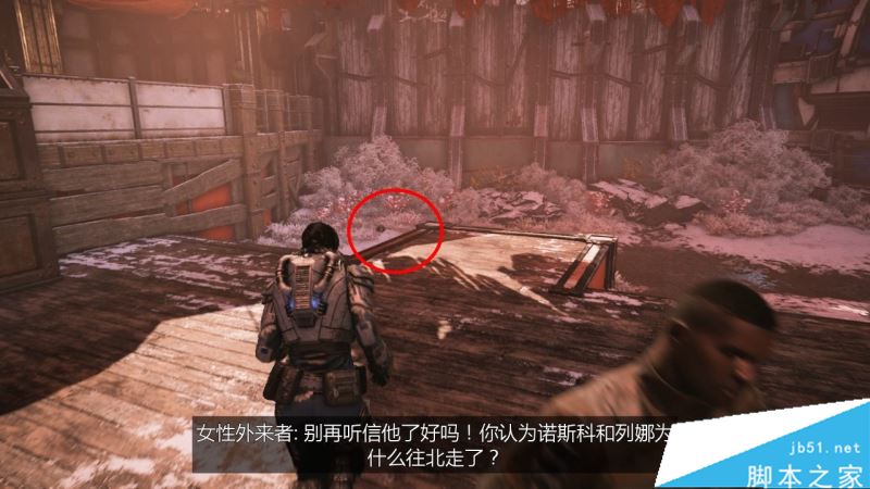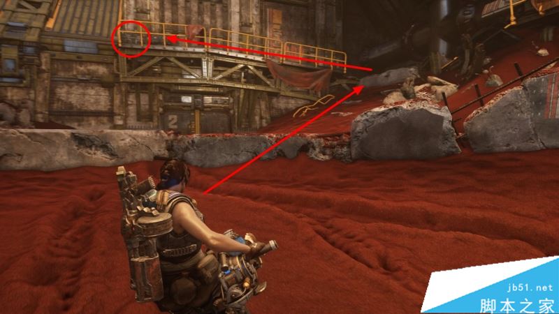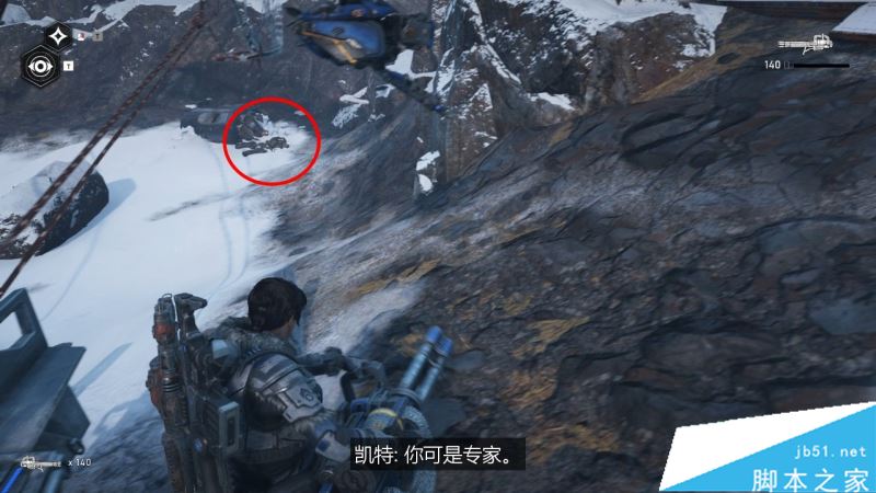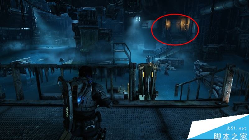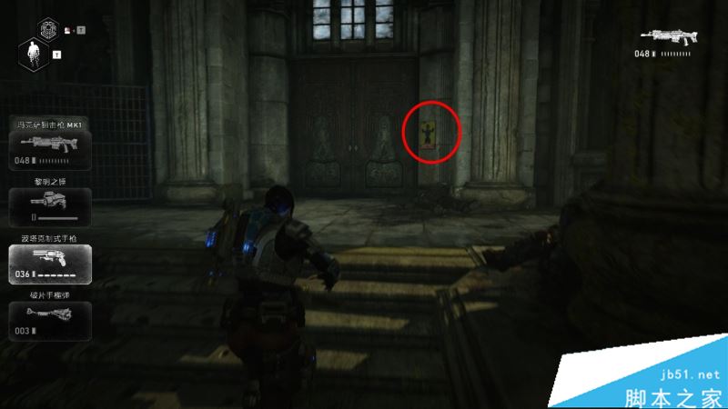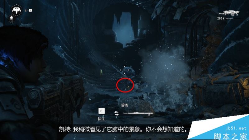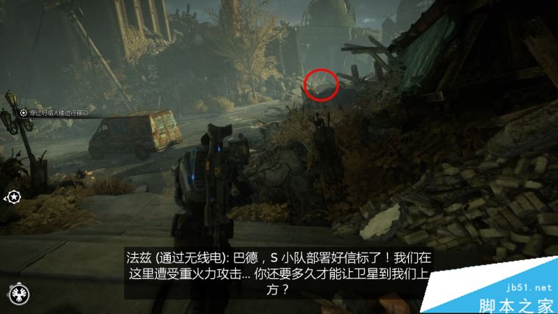 消灭完敌人后,和凯特打开通道,继续向前就会遇到掷弹兵,同样找好掩体将其以及后面来的敌人击杀。来到下图位置,向红圈位置丢一颗手雷,可以击杀大量敌人。
