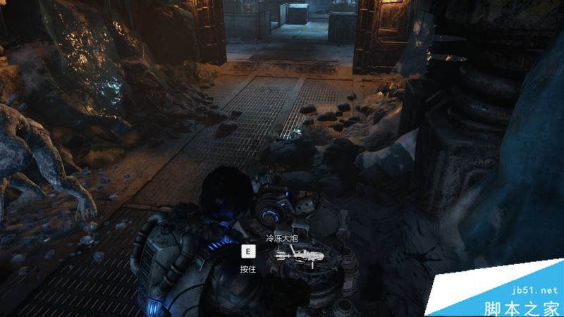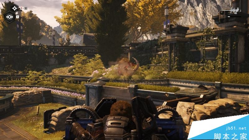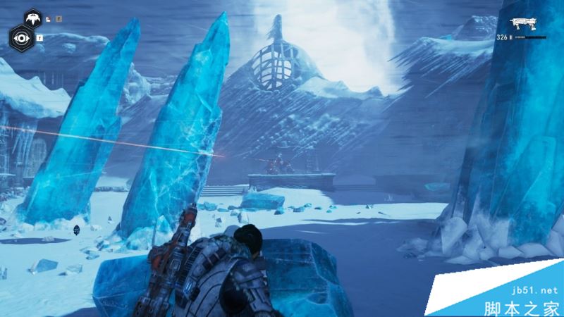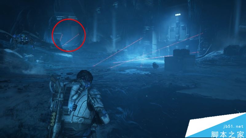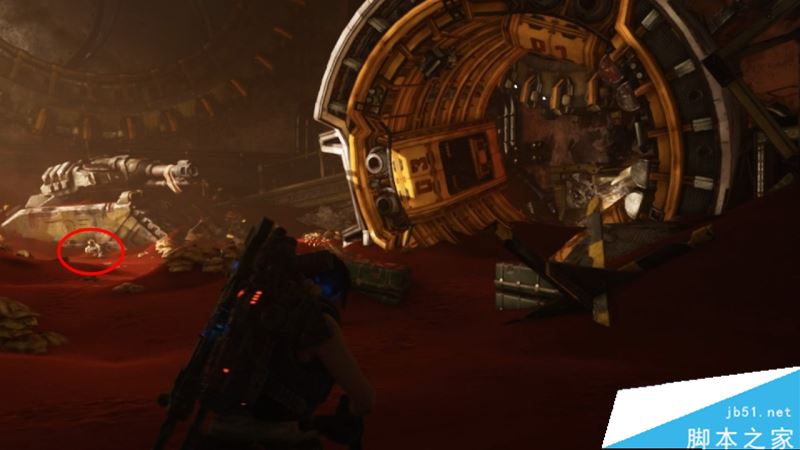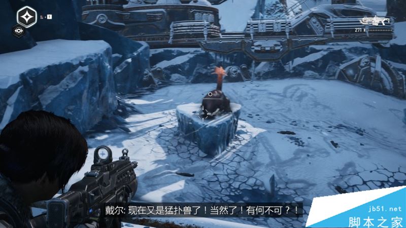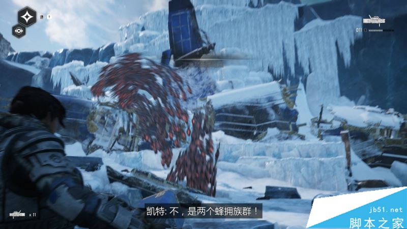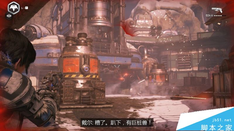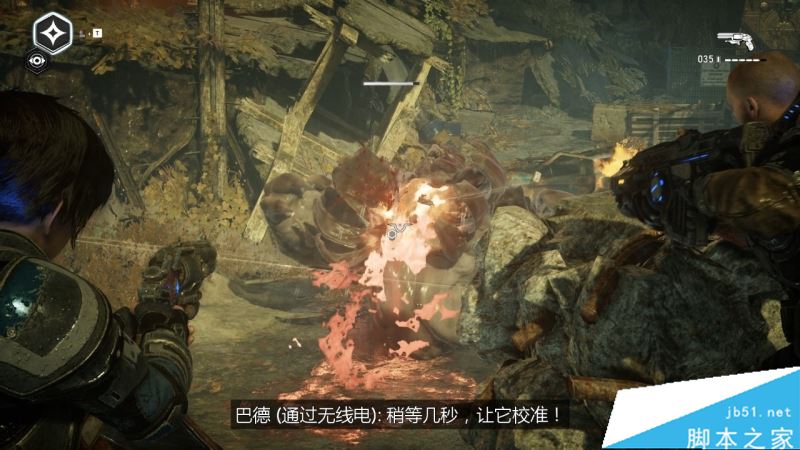 出来之后,会看到两个带原兽,这时不要乱动,藏好就可以了,一会儿黎明之锤就会射下来激光消灭敌人,不要浪费子弹。接下来还会看到柯尔操作的大型战争机器清理了一些小兵,我们不需要动手。