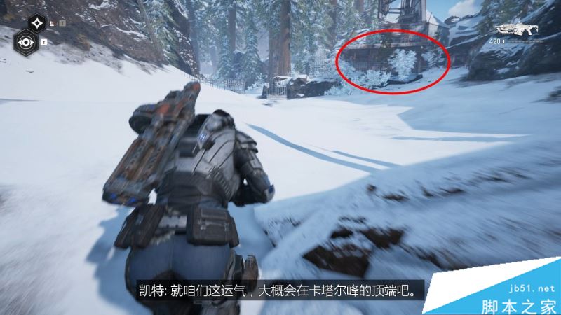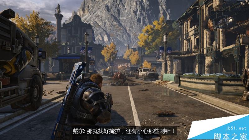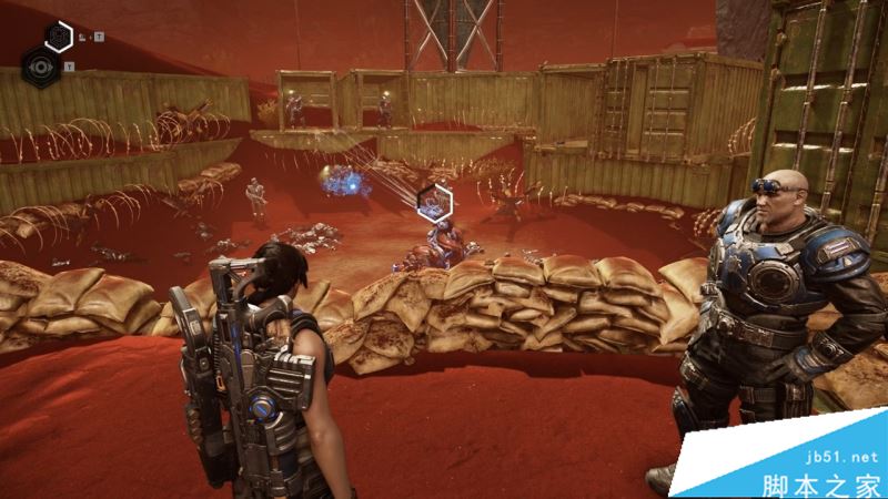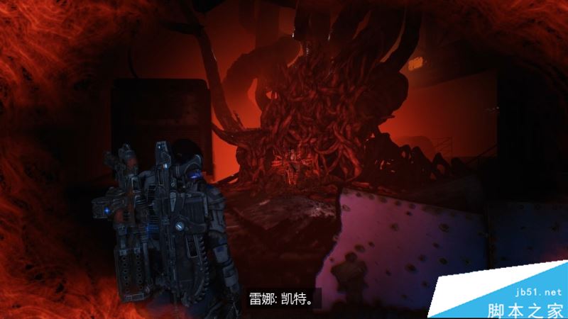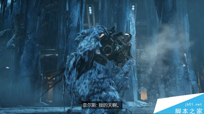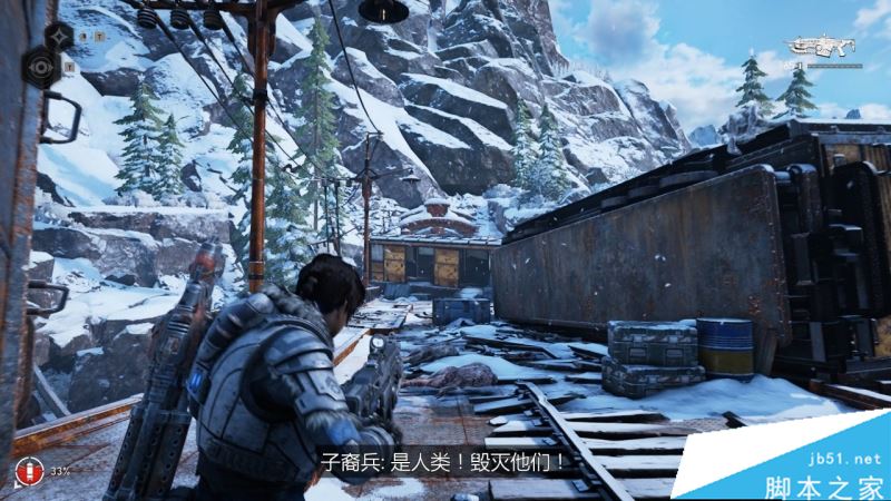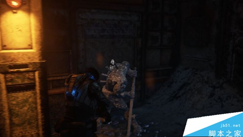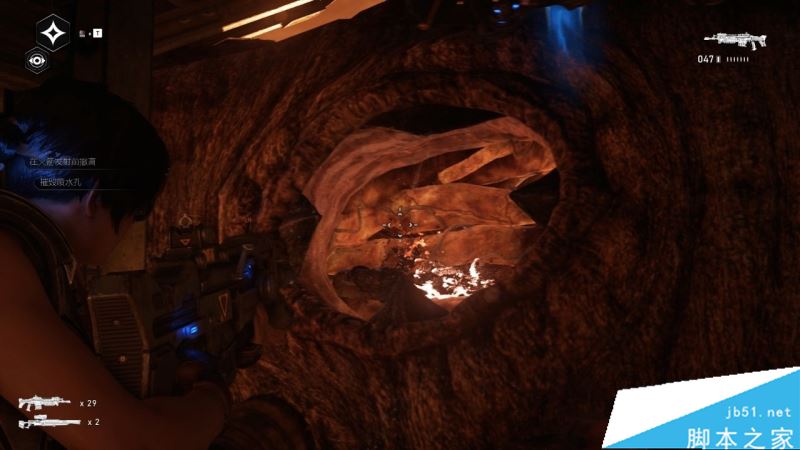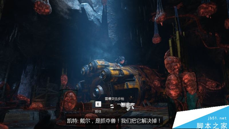 出来之后,会看到两个带原兽,这时不要乱动,藏好就可以了,一会儿黎明之锤就会射下来激光消灭敌人,不要浪费子弹。接下来还会看到柯尔操作的大型战争机器清理了一些小兵,我们不需要动手。