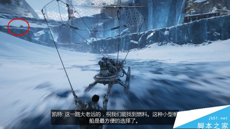 完成后乘坐小帆船,前往流浪者车队目标地点,到了下图位置可以进入,里面是三个猛扑兽,只要用闪光弹冰冻处理就可以了。在一进入区域,向右看就能在地上看到一个收集品,拾取获得【收藏品:战死流浪者的面甲】。