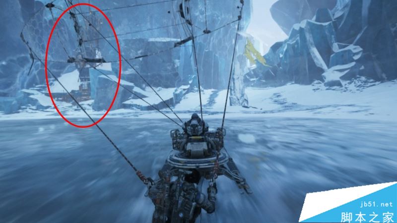 继续向前看到挡路的电线,无论是用骑兵突击步枪还是用近战攻击都可以割断通过。
