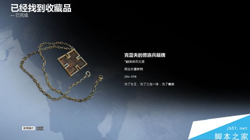 进入内部后,进行一番搜刮,在士兵的尸体旁边可以找到【收藏品:战士兵籍牌-阵亡的亚祖拉战士】