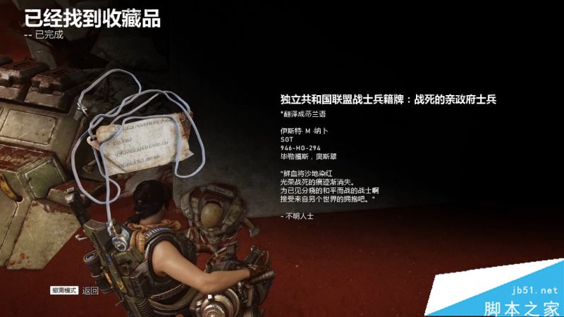 在火箭机库外,可以在门口的尸体上获得【收藏品:独立共和国联盟战士兵籍牌:战死的亲政府士兵】。