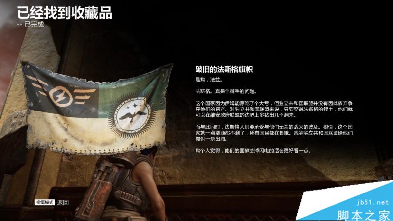 继续向前走,在一个破旧的墙壁上会看到一面旗子,拾取获得【收藏品:破旧的法斯格旗帜】,在前方还可以拾取【组件*3】。之后从房屋破口处跳下就可以完成此场景任务了。