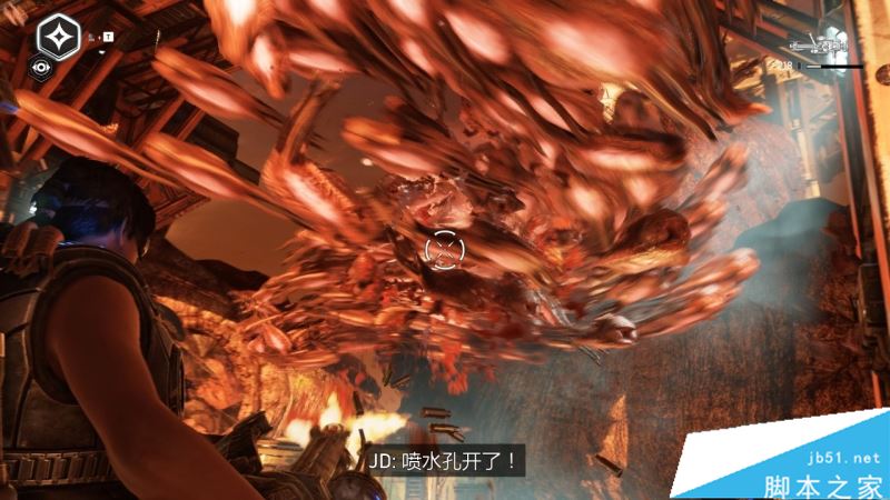接下来就是四人前往发射火箭,此时出现了一个巨型生物将四人围住,这里的打法非常简单,对着他的“喷水口”射击就可以了,反复数次,每到一个平台都会大量的弹药补给。