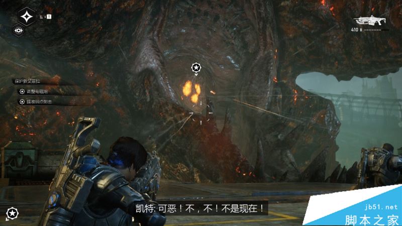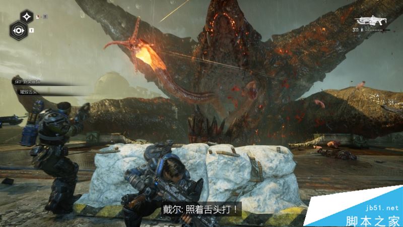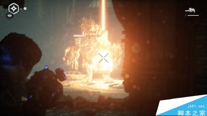 从右侧绕道对面的楼,清理完楼上的敌人,马可斯会来安置信标,信标安置好之后,旁边有两个激光枪,拿起对着蜂龙兽射击,天上就会砸下来黎明之锤的激光,可以非常爽的解决战斗。