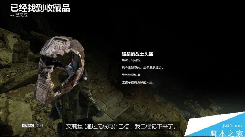 离开建筑,来到室外后,剧情是向左的,我们先向右拾取【收藏品:破裂的战士头盔】。